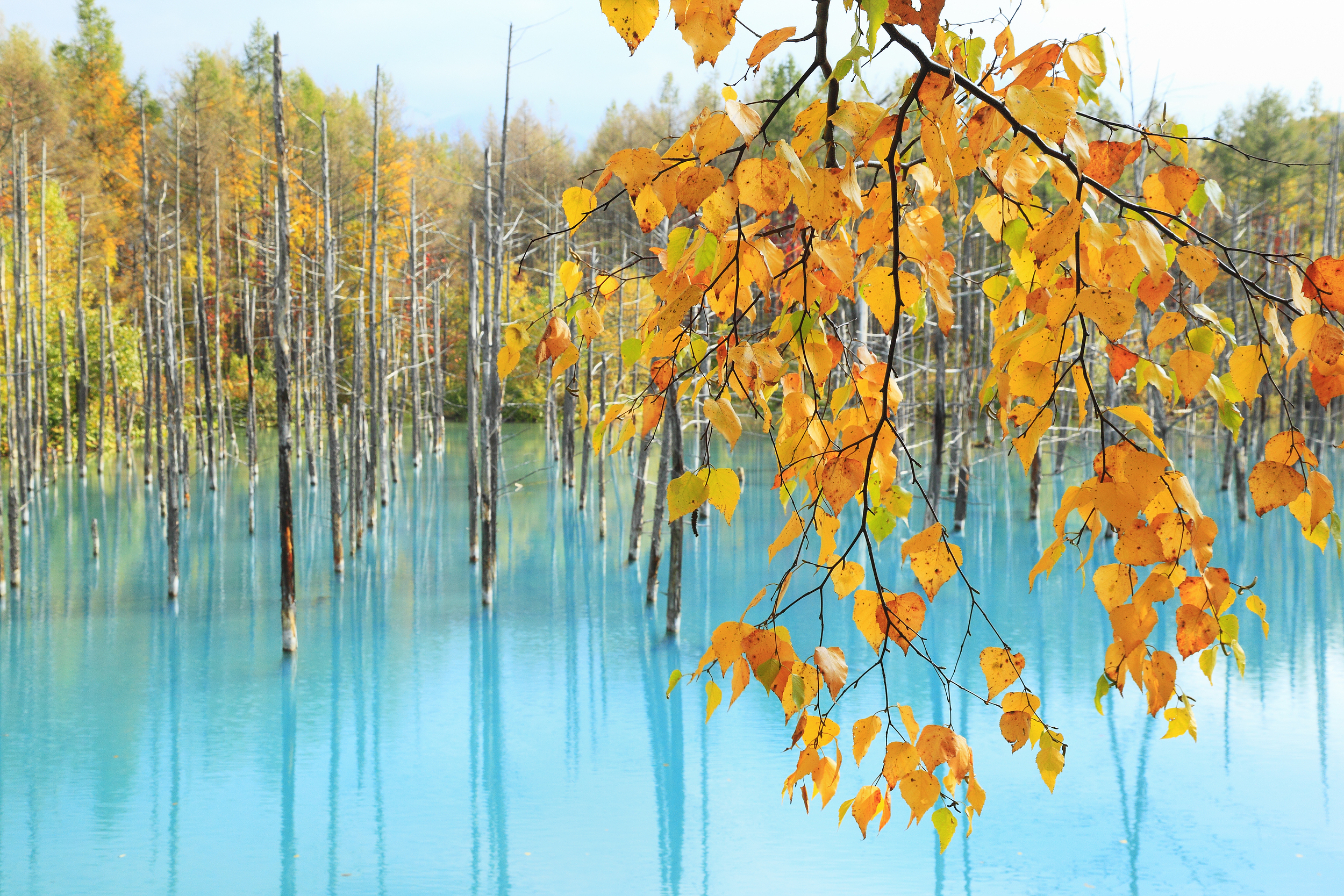 Голубой пруд Сироганэ, или Аоиикэ, — это поразительный искусственный пруд, расположенный в лесах недалеко от Биэй, Хоккайдо. Он получил международное признание после того, как его изображение стало стандартными обоями для macOS Apple. Отличительный синий цвет пруда, который варьируется от бирюзового до глубокого лазурного, объясняется естественным гидроксидом алюминия, взвешенным в воде, отражающим синий свет с более короткой длиной волны. Это уникальное явление в сочетании со скелетными остатками лиственниц и серебристых берез, выступающих из воды, создает неземной и часто сюрреалистический пейзаж, который привлекает посетителей со всего мира.