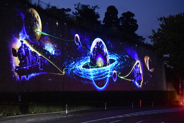 «Железная дорога Галактической Земли Будущего Города» — это замечательная 80-метровая фреска в городе Ханамаки, префектура Иватэ, созданная местным художником Осами Ямамото. Заказанная в 1993 году для украшения новой дороги, эта работа отдает дань уважения известному фэнтезийному роману Кэндзи Миядзавы «Ночь на Галактической железной дороге». Что делает ее особенно особенной, так это ее преображение после наступления темноты: почти невидимая днем, она освещается ультрафиолетовым светом после захода солнца, открывая потрясающее, светящееся в темноте изображение яркой галактики, пересекаемой паровозами.