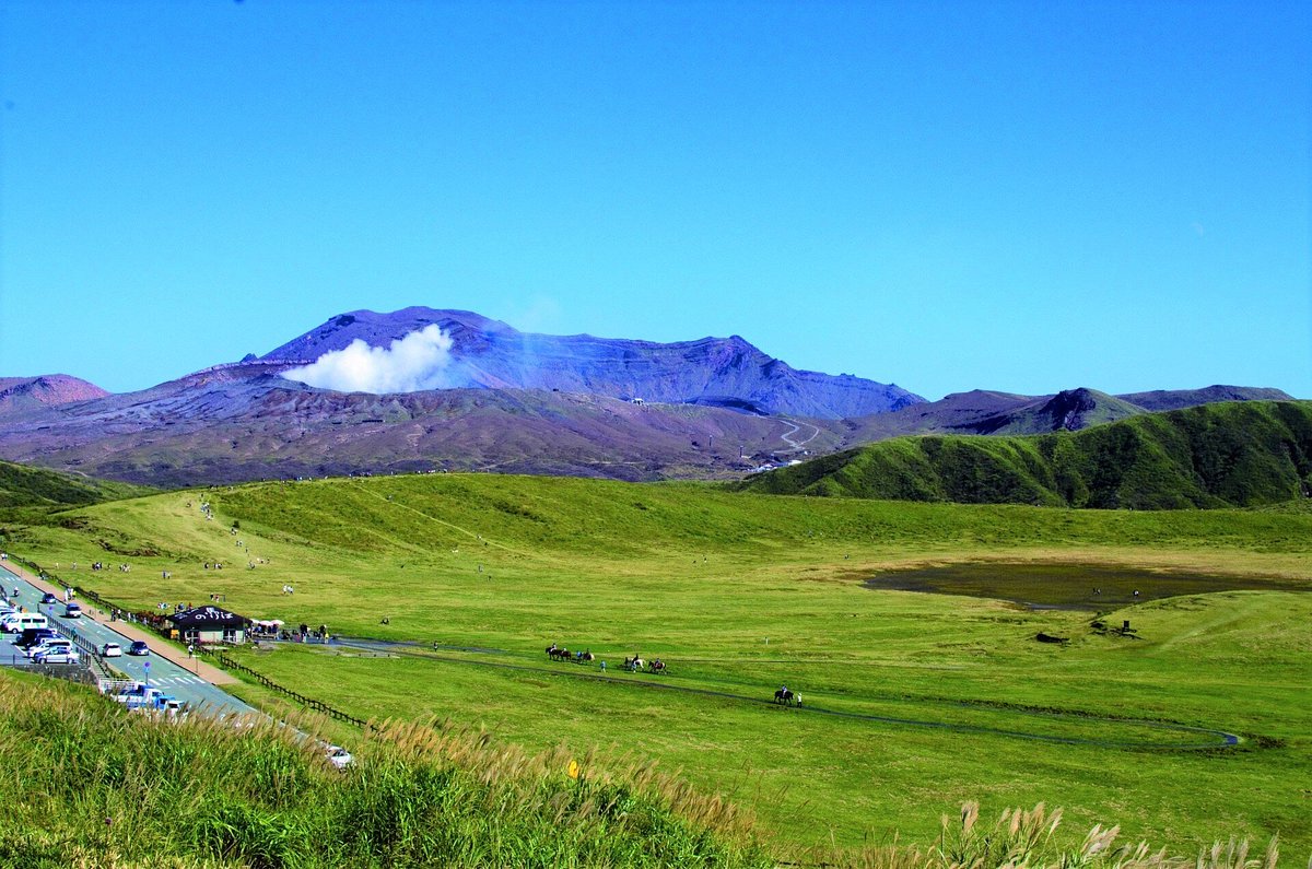 Кусасенригахама — это обширная, изумрудно-зеленая прерия, расположенная в кальдере горы Асо, крупнейшего действующего вулкана Японии. Это не просто живописная смотровая площадка; это неотъемлемая часть Национального парка Асо-Кудзю, предлагающая уникальную возможность вблизи познакомиться с первозданной, величественной красотой вулканического ландшафта. Обширные луга, часто усеянные пасущимися лошадьми и крупным рогатым скотом, резко контрастируют с постоянно присутствующим шлейфом дыма из близлежащего кратера Накадаке, что делает это место райским уголком для фотографов и умиротворяющим убежищем для души.