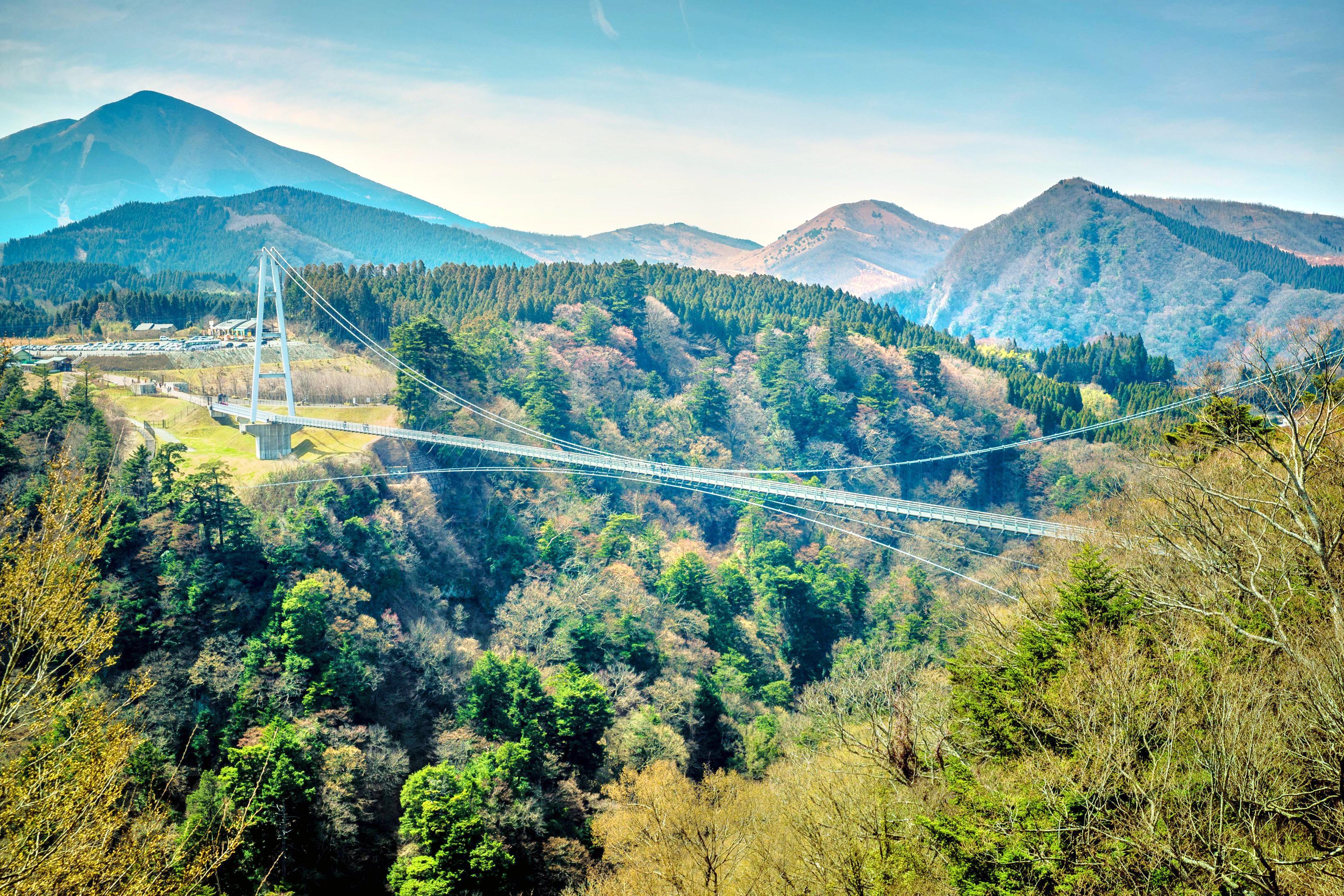 Мост Коконоэ Юмэ Оцурибаси, часто называемый «Мостом Мечты», является самым высоким пешеходным подвесным мостом в Японии, протянувшимся на 390 метров через долину реки Наруко. На высоте 173 метра над водой он предлагает несравненные виды на окружающую природную красоту, включая знаменитый водопад Вибрации, один из 100 лучших водопадов Японии. Это инженерное чудо спроектировано так, чтобы выдерживать до 1800 взрослых, обеспечивая стабильную, но волнующую прогулку.